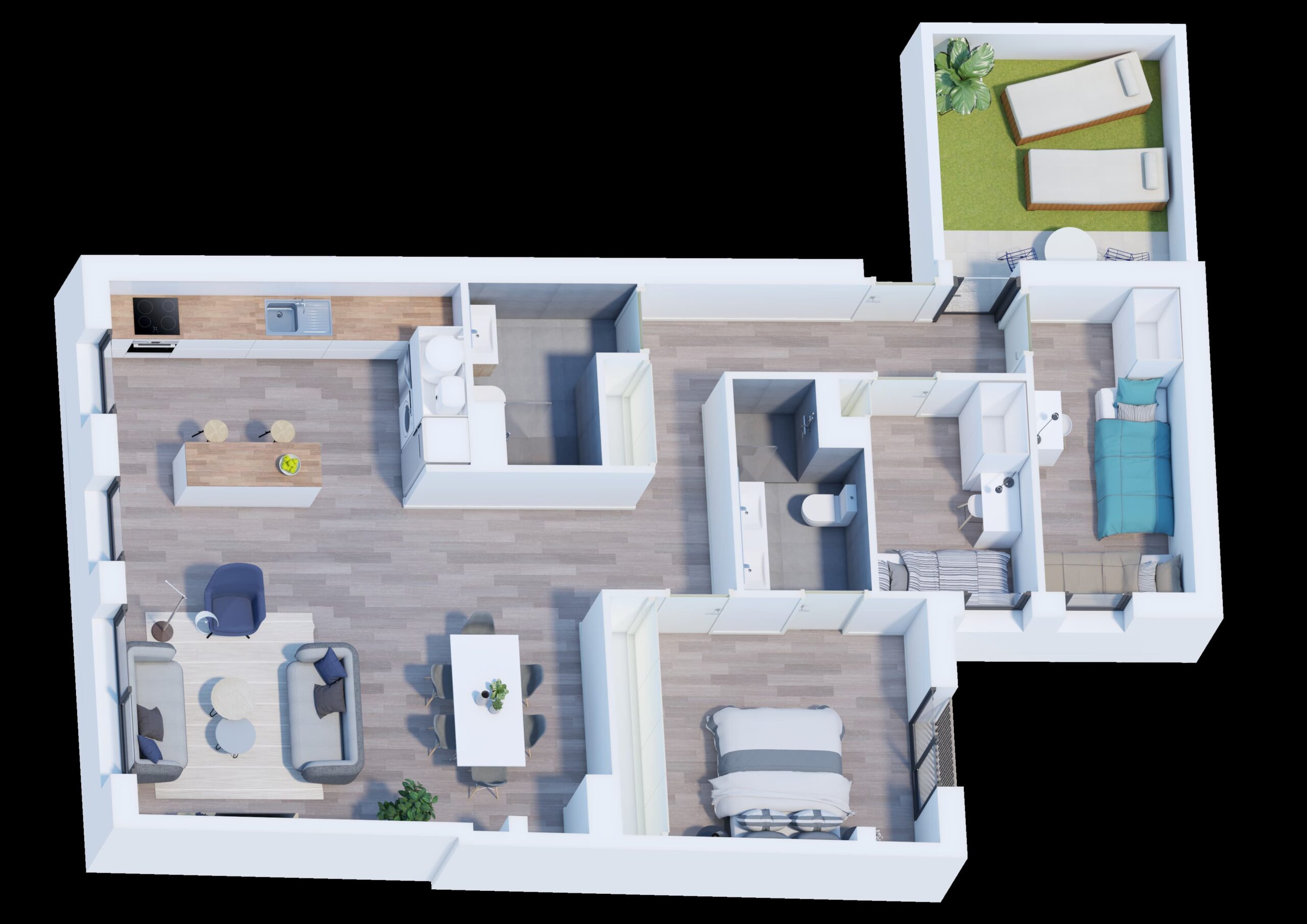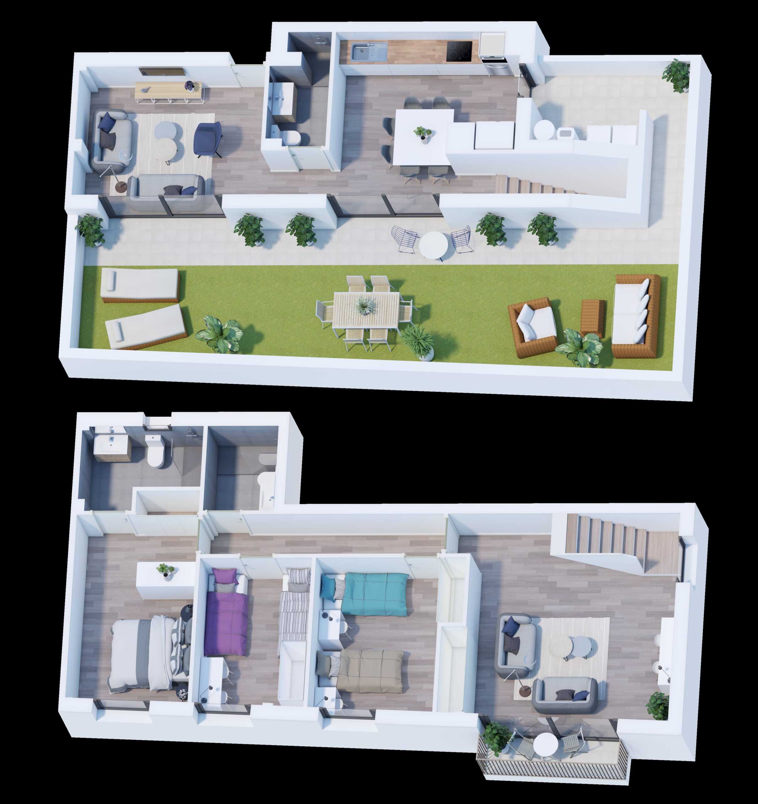 Diseño sobre plano. Imágenes no contracturales, meramente ilustrativas sujetas a modificaciones de orden técnico, jurídico o comercial, instrucciones de la Dirección Facultativa o Autoridad Competente . Las imágenes de fachadas, elementos comunes y restantes espacios son orientativos y podrán ser objeto de verificación o modificación en los proyectos técnicos. El mobiliario mostrado en las imágenes de interior no está incluido y el equipamiento de las viviendas será el indicado en la correspondiente memoria de calidades.